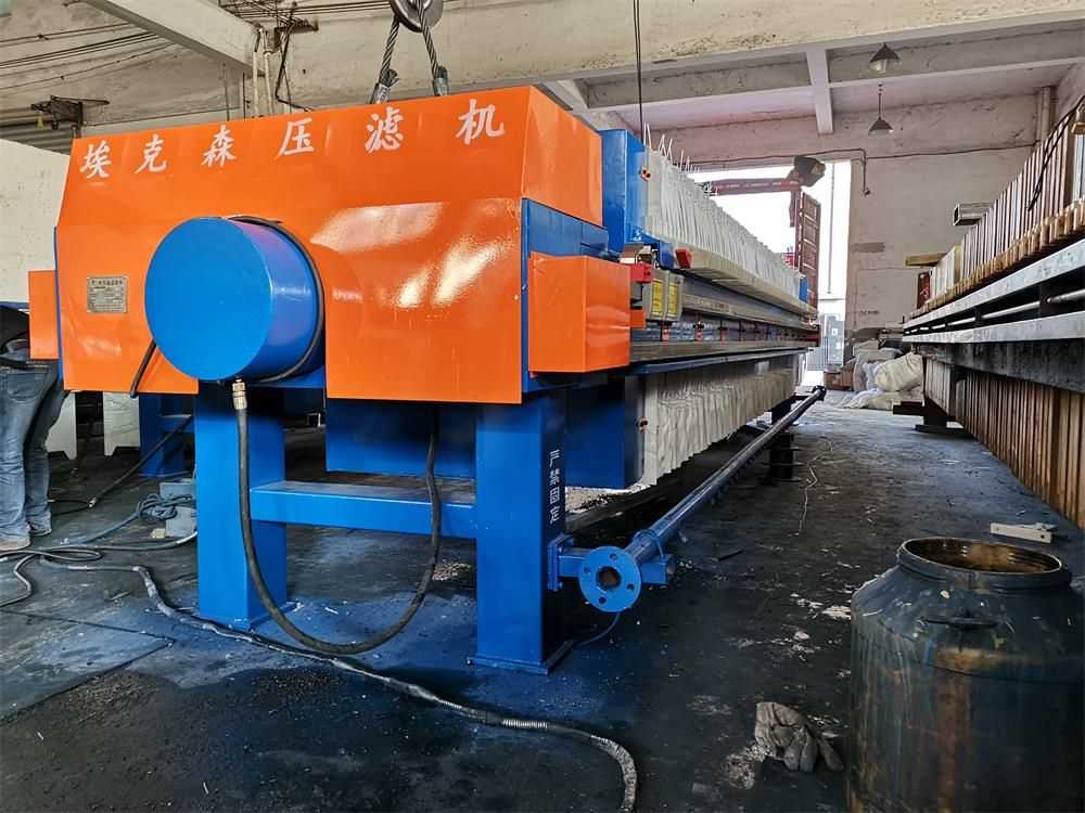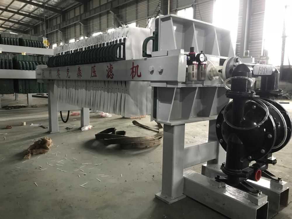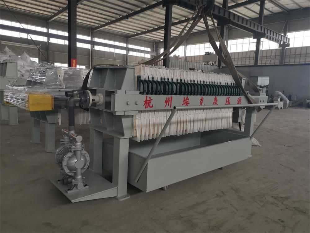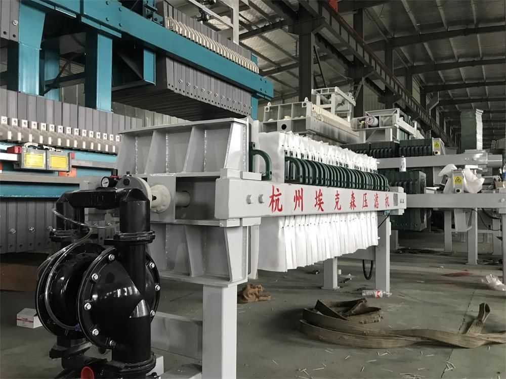 隔膜壓榨壓濾機(jī)是由隔膜板和廂式濾板排列組成濾室,在輸料泵的壓力作用下將料漿輸入濾室,通過過濾介質(zhì)(濾布)將料漿中的固體和液體分離,當(dāng)料漿中的固體形成餅后,再向隔膜通入空氣,對濾室內(nèi)的固體充分壓榨。